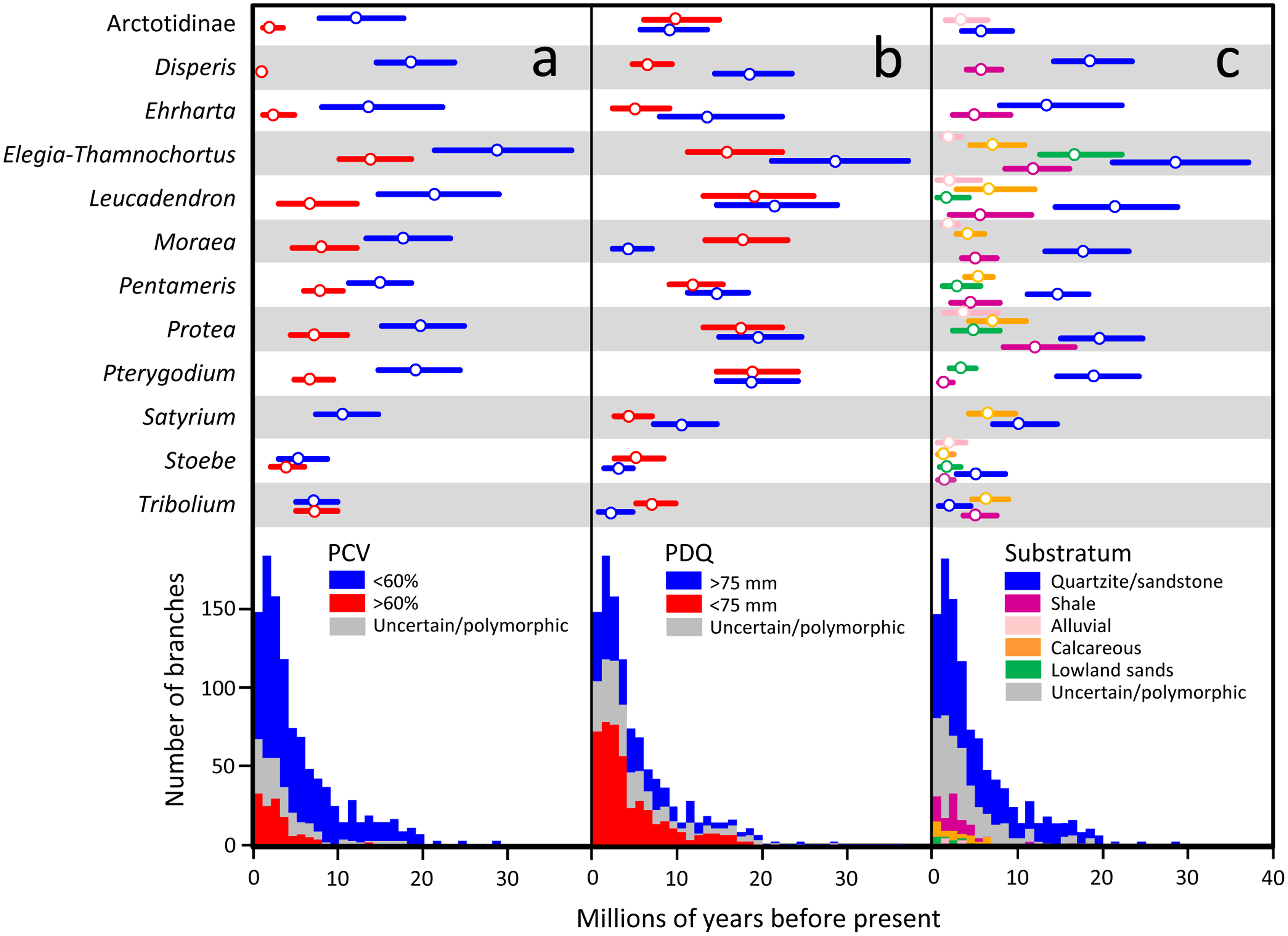 Upper panel: Error plots (median ± 0.95 HPD) depicting, for each clade, the earliest transition to each alternative habitat state defined under: a) coefficient of variation of monthly precipitation (PCV); b) precipitation during the driest quarter (PDQ); and c) substratum (bedrock geology). Lower panel: Stacked frequency histograms depicting temporal change in the numbers of branches, across all 12 clades, reconstructed as possessing each alternative habitat state.